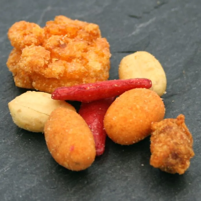 Ingredienser Jordnødder Ristet / saltet: jordnødder, jordnøddeolie, salt. Katjang Pedis: jordnødder, hvedemel, krydderurter artoffelstivelse, farve: E160c), vegetabilsk olie (soja), salt, æg, løg, sukker. Små røde persimmoner: sojasovs, sukker, gær, modificeret tapiokastivelse, farve E120, glucosesirup, chilipulver. Krydderier: Krydderier, jordnødder, majsstivelse, ris, sukker, salt, krydderier, farvestoffer: E100, E120, E160b og E160c, hvidløg, bouillonpulver (hydrolyseret sojaprotein, solsikkeolie), løg, tomatpulver, antiklumpningsmiddel: E551, gær ekstrakt, capsicum ekstrakt, hydrolyseret vegetabilsk protein (indeholder soja), maltodextrin, matsyre: E330, oregano ekstrakt.