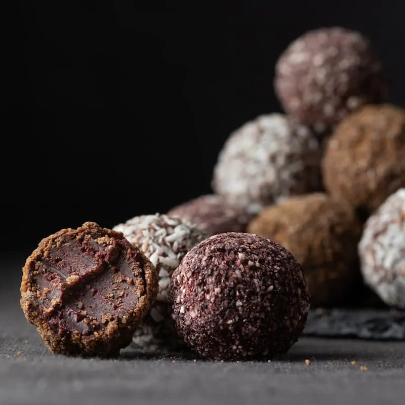 Vælg enten at rulle kuglerne i kokosmel eller hakkede peanuts, eller dyp dem i smeltet mørk chokolade.